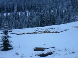 Diese Zeit habe ich dann mit meinen beiden Helfern Andre und Vasil genutzt um Bauholz zu schlagen und mit dem schon Ende 2009 gekauften, transportablen Sägewerk zurechtzuschneiden. Das war eine wirklich eisige und anstrengende Arbeit, denn wir mussten die Bäume – bei bis zu 20 Minusgraden – in einem ca.1 km entfernten Waldstück erst fällen und dann mit einem Pferd zum Grundstück ziehen.
